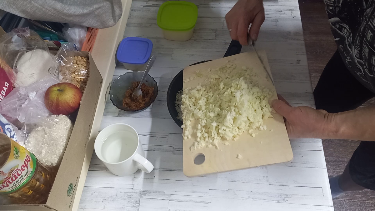 Всем здравствуйте. Меня зовут Ирина. Мы с сыном Денисом иногда проводим экспериментальные проекты на выживание и не только. Сразу скажу, что мы оба работаем и подрабатываем. Наши проекты – это наша инициатива и желание. Данный новый проект - одиночный, в котором участвовать буду только я. Денис уехал в Киров по работе почти на две недели((( Проект будет длиться 14 дней, и я планирую потратить не больше 1500 рублей. День ШЕСТОЙ моего проекта))) Почти половина))) Продукты есть, деньги тоже, правда не так уж много))) На завтрак решила сделать заливной пирог с капустой. И у меня со вчера еще осталась каша, так что будет на завтрак у меня и пирог и каша))) Капусту натерла на крупной терке и потушила на сковороде вместе с луком и морковкой (тоже остались со вчера). Без масла, на воде))) Тесто самое простецкое, почти что как на оладьи. Кефир, сахар, соль, сода, масло растительное и мука. Все перемешиваем и готово. Ну а дальше дело техники. В форму выливаем тесто, выкладываем начинку и снова