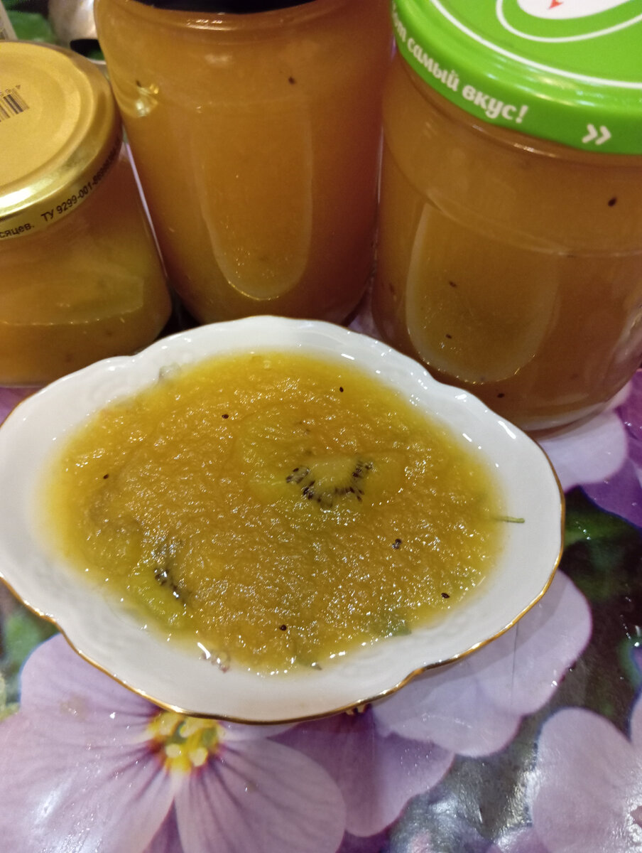 Сладкое и ароматное пюре из груши в сочетании с кисловатыми кусочками киви образует в этом варенье вкусный дуэт. Список продуктов: -700 грамм очищенной от кожуры и семян груши -300 грамм киви без кожицы -500 грамм сахарного песка -1-2 столовые ложки лимонного сока по вкусу и желанию можно добавить немного крепкого алкоголя (коньяка или рома), ваниль (ванильный сахар), корицу. Груши очищаю от кожицы, освобожаю от сердцевины, плодоножки , вырезаю все поврежденные места и нарезаю произвольными кусочками. Нарезанные груши держу в подкисленной лимоном или лимонной кислотой воде, чтобы фруктовые кусочки не темнели. Как только все груши будут готовы, воду сливаю. С киви тонко снимаю волосатую шкурку, разрезаю вдоль на две половинки , затем на ломтики толщиной 3-5 мм. Ставлю посуду с грушами на небольшой огонь и развариваю фрукты до мягкости. С помощью блендера измельчаю груши в пюре , добавляю сок лимона , ломтики киви и сахарный песок. Аккуратно помешивая, довожу смесь до