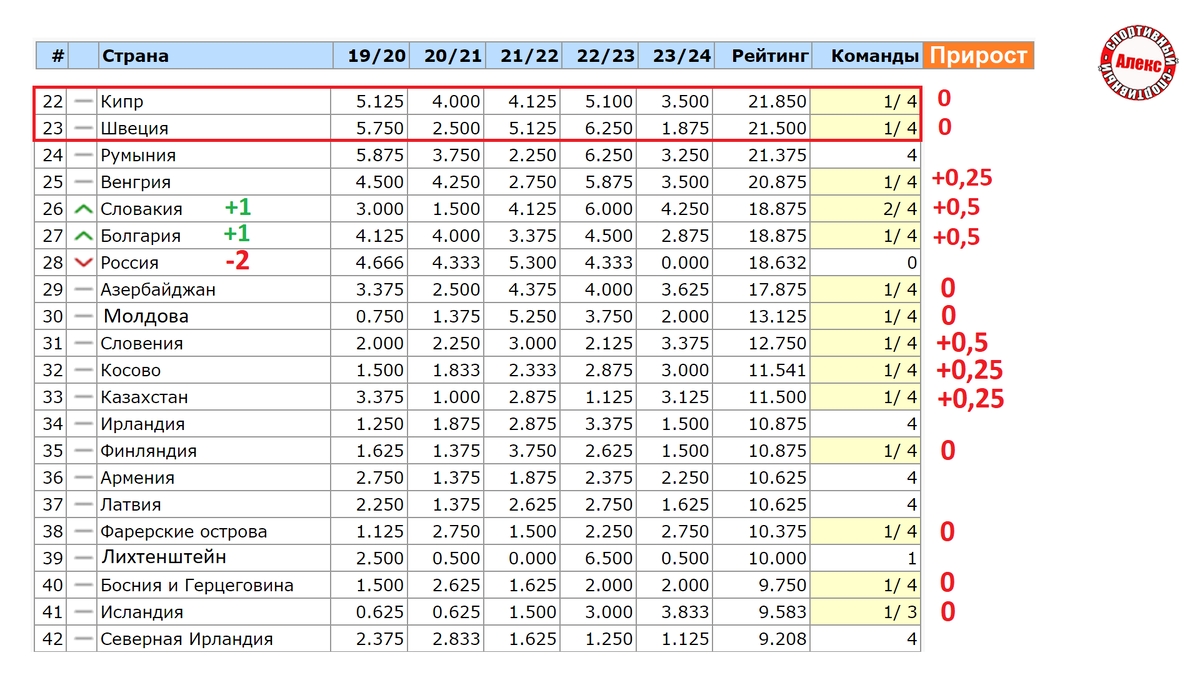 В Лиге Чемпионов, Лиге Европы и Лиге Конференций завершился 4-й тур. Какие изменения произошли в рейтинге УЕФА? Кто на этой неделе стал лидером по приросту очков? У Исландии и Боснии, которые находятся в 4-мдесятке, очков на этой неделе нет, поскольку Брейдаблик и Зриньски уступили. У Фарер и Финляндии аналогичный случай, хотя Клаксвик до последних минут держал интригу. Встречаем первые страны, пополнившие свои копилки. Собственно Астана сыграла вничью с косовскими Балканами. У этих стран по 0,25 очка. 31-я Словения на прошлой неделе была с нулём, на этой - +0,5. Молдова и Азербайджан похвастаться ничем не могут, так как Карабах и Шериф потерпели поражения в своих группах. Россия с 26-го места опустилась на 28-е. -2 позиции вниз. Болгария поднялась на одну ступень. +0,5. То же самое у Словакии. Вы уже догадываетесь, страны, имеющие перед стартом сезона 4 команды за ничью, получают 0,25. Венгерский Ференцварош сыграл с Генком 1-1. Кипр и Швеция тоже без очков. На 21-м месте находится Хо