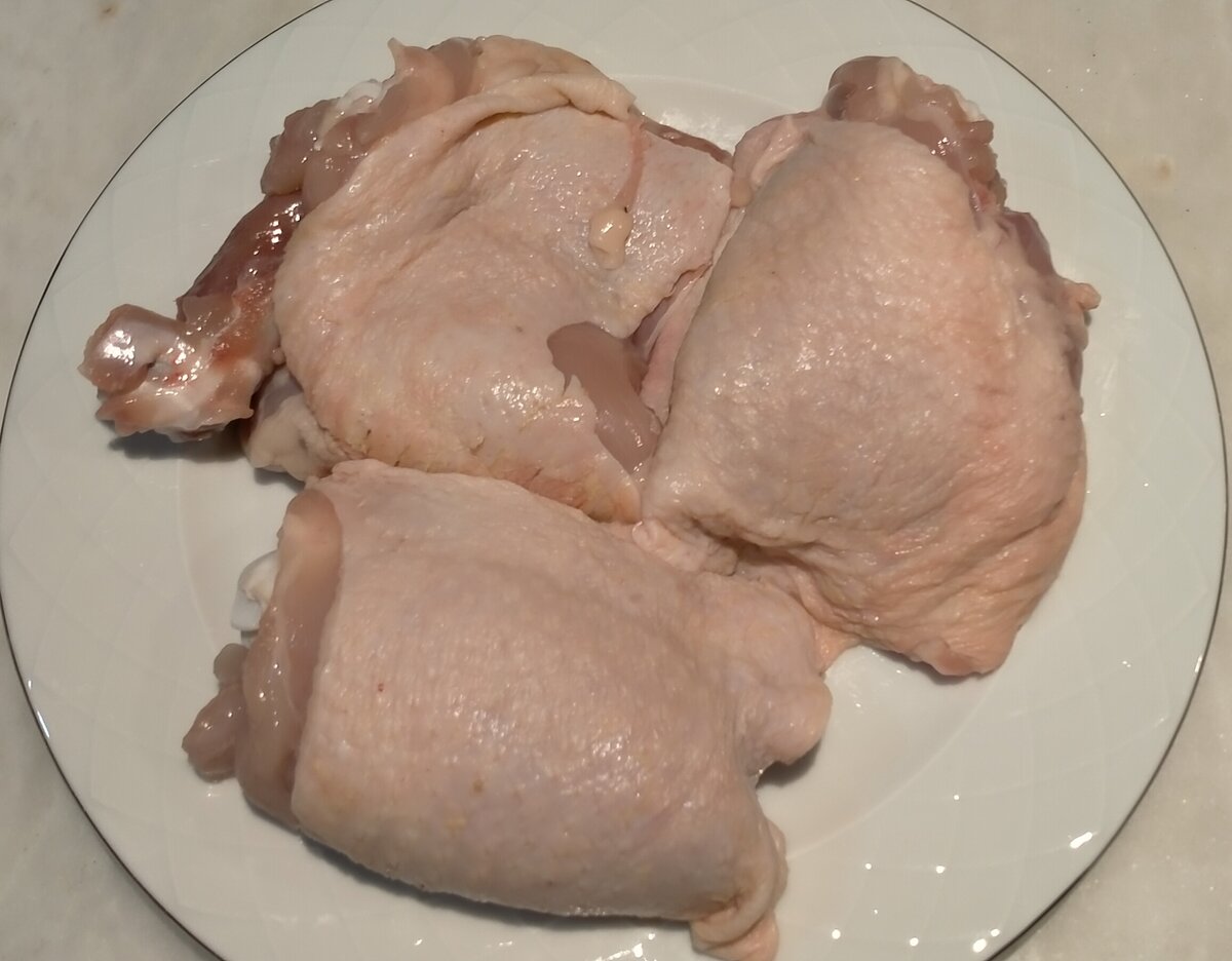 - Я взяла три куриных бедра на кости промыла и обсушила бумажными полотенцами