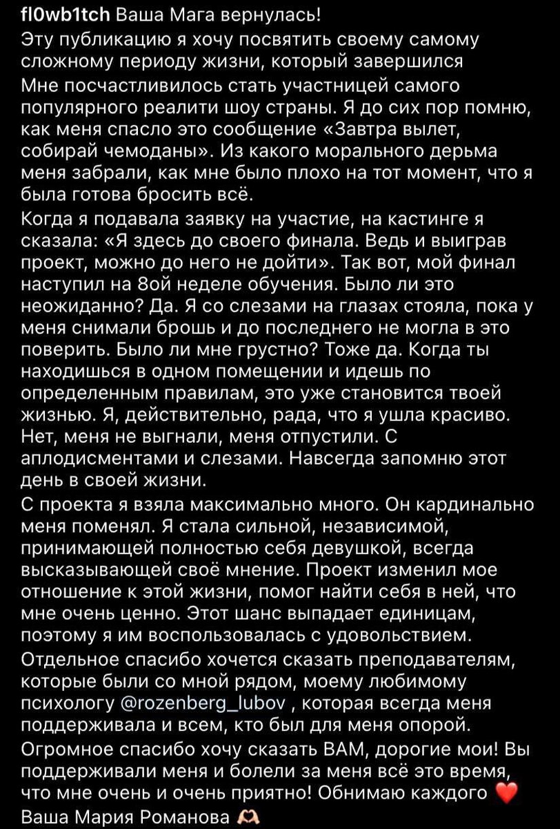 😊 Маша Романова вышла на связь! «Нет, меня не выгнали, меня отпустили. С аплодисментами и слезами. Навсегда запомню этот день в своей жизни. С проекта я взяла максимально много. Он кардинально меня поменял. Я стала сильной, независимой принимающей полностью себя девушкой, всегда высказывающей своё мнение. Проект изменил мое отношение к этой жизни, помог найти себя в ней, что мне очень ценно.» – написала Маша Романова.