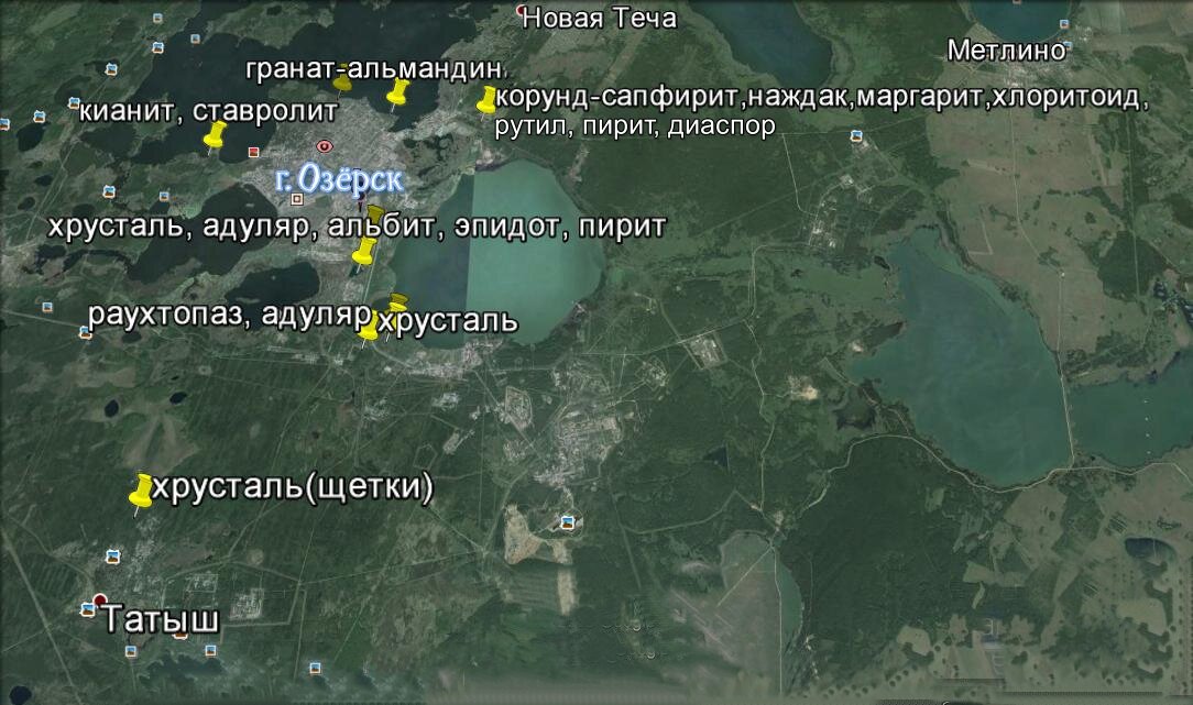 Озёрский городской округ богат разнообразием найденных в нём минералов. Это и гранаты-альмандины, друзы и отдельные кристаллы адуляра, кианиты и ставролиты, пириты, альбиты, кальциты и многое другое. Но особое место в этом списке занимают горные хрустали и дымчатые кварцы, иногда частично замещённые прохлоритом.