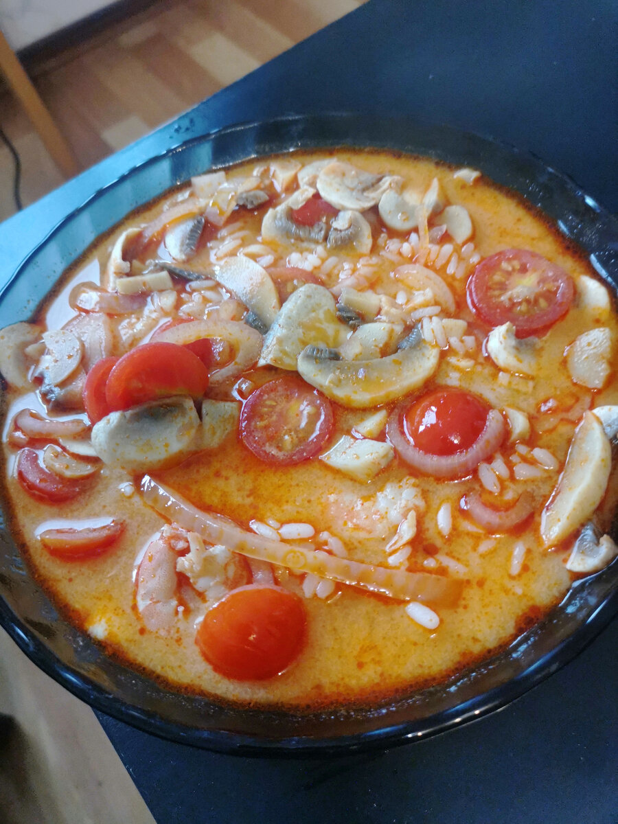 Национальное блюдо Тая и Лаоса в студию! Как я люблю японскую, корейскую, китайскую и вьетнамскую еду. Ох! Только вот желудок мой почему-то её не любит. Наверное, потому что в России мы не привыкли есть архи-острое. Том-Ям суп острый, но в меру. Я его готовлю с суповой основой. Покажу ее на фото. На пакете есть полный рецепт. Я покупаю в рыбном гастрономе, но можно найти, наверное, на Озон или WB, если в вашем населенном пункте не продают такое. Вот тут всё, что нам потребуется: Особенности приготовления продуктов Лук по рецепту рекомендуется синий (сиреневый) лук. Я такой люблю, сажаю. В этом году у меня был Кармен. Прекрасный крупный лук. Мне кажется, что с белым будет совсем не так по вкусу. Кто лук не любит, можно исключить из рецепта. Или заменить на порей. Рис лучше всего брать длиннозерный пропаренный, он хорошо рассыпается. Фишка риса в Том-Ям в том, что вы можете регулировать количество риса и увеличивать количество еды. Например, если суп готовите просто побаловать с
