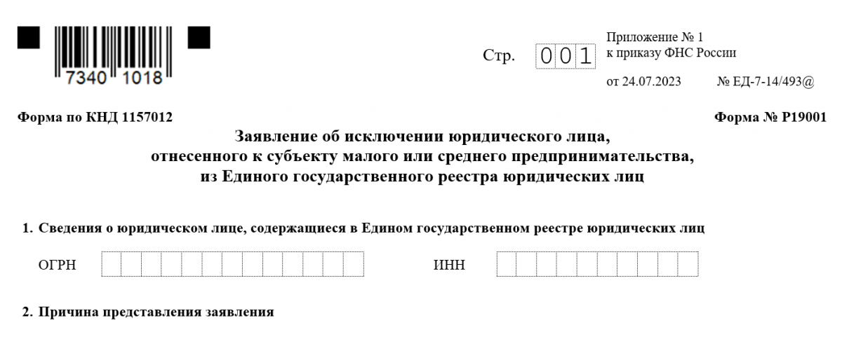 Форма Р19001 предназначена для упрощенного исключения из ЕГРЮЛ субъектов малого и среднего бизнеса (МСП). Посмотреть Скачать В связи с чем введена форма р19001 С июля 2023 года действуют изменения, внесенные в Закон о госрегистрации и Закон об ООО в части добровольной ликвидации субъектов малого предпринимательства в упрощенном порядке (Федеральный закон от 13.06.2023 № 249-ФЗ). В результате в Федеральный закон от 08.08.2001 № 129-ФЗ внесена статья 21.3 регламентирующая особый порядок снятия с учета для некоторых компаний. Для этого учредители предприятия принимают соответствующее решение и передают письменное заявление по упрощенной форме в ФНС. Применение нового порядка возможно для следующих категорий организаций: Самое главное, нужно подать в ФНС заявление о ликвидации, оформленное надлежащим образом. Форма р19001 образец и порядок заполнения Бланк заявления и порядок его оформления утверждены Приказом ФНС России от 24.07.2023 № ЕД-7-14/493@. Его оформляют на русском языке в 1 экзе