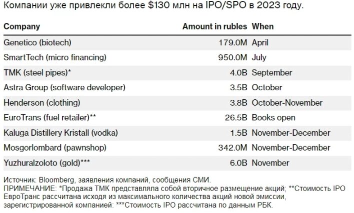 В этом году в Москве компании продали акций на $130 млн. Топливный ритейлер и золотодобытчик могут вскоре продать акции в ходе IPO Российские розничные инвесторы довели базовый индекс Москвы до уровня, который последний раз наблюдался перед началом конфликта на Украине. Их деньги сейчас переманивают десятки компаний для продажи акций на бирже. По данным Bloomberg, полдюжины компаний в самых разных отраслях, от информационных технологий до одежды, продали акции на сумму более 12,4 млрд рублей (130 млн долларов США) в ходе первичного и вторичного публичного размещения акций в этом году после всего лишь одного успешного IPO в прошлом году. Розничные инвесторы, имея на своих счетах примерно в восемь раз больше денег, чем прежде, доминировали в торгах этого года. Компании уже привлекли более $130 млн на IPO/SPO в 2023 году. Источник: Bloomberg, заявления компаний, сообщения СМИ. ПРИМЕЧАНИЕ: *Продажа ТМК представляла собой вторичное размещение акций; **Стоимость IPO ЕвроТранс рассчитана исхо