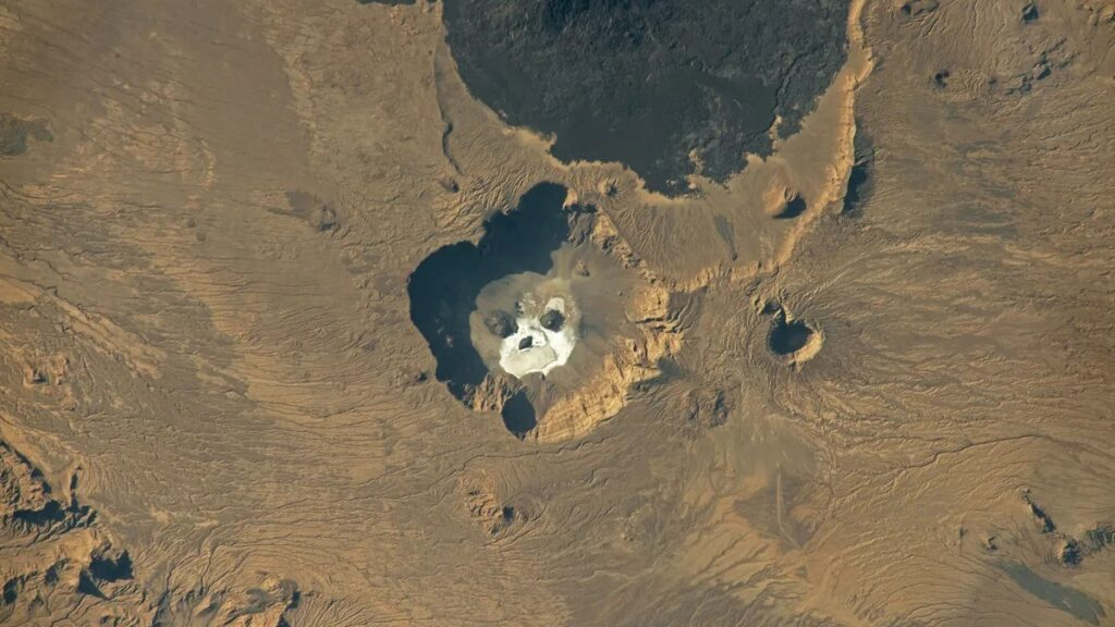 Один из астронавтов на борту Международной космической станции (МКС) запечатлел призрачный череп во время полета над пустыней Сахара. Изображение, которым поделилась Земная обсерватория НАСА, на самом деле представляет собой вулканический кратер. Эта вулканическая кальдера имеет глубину тысячи метров и диаметр от 6 до 8 километров. Большая часть дна огромной ямы покрыта слоем белой соли, известной как натрон, которая представляет собой смесь карбоната натрия, бикарбоната натрия, хлорида натрия и сульфата натрия. Более того, черные дыры, образующие глаза и нос призрачного черепа, на самом деле представляют собой высокие шлаковые конусы, образовавшиеся вокруг жерл вулканов. Череп расположен среди гор Тибести, самого высокого горного массива Сахары на высоте 2450 метров. Горы считаются одним из самых отдаленных и изолированных уголков планеты. Несмотря на суровую окружающую среду, горы Тибести являются домом для огромного биоразнообразия, включая лисиц, газелей, африканских диких кошек и