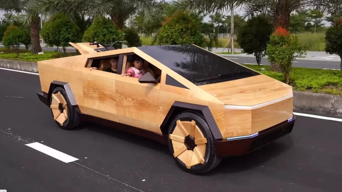 Внутри деревянной копии Tesla Cybertruck установлена аккумуляторная батарея и электродвигатель.