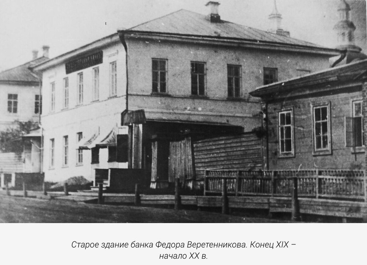 1 ноября 1862г. основан первый в городе общественный банк Ф.Веретенникова, который располагался в приспособленном под банковское учреждение двухэтажном каменном доме на северной стороне улицы Спасской. Во время очередного визита на свою малую Родину в Вятку в 1848 г. Петр Федорович ознакомился с местной торговлей и промышленностью и пришел к мысли о необходимости учреждения общественного банка, который мог бы стать средством для развития деловой активности Вятки. Новое двухэтажное в стиле модерн здание вятского городского банка имени Федора Веретенникова на ул.Спасской построено в 1913 году, к 50-летию банка. Автор проекта - губернский архитектор И.А. Чарушин. После 1918 г. здесь помещался губком комсомола, затем - гарнизонный клуб офицеров. Фасад здания и внутренняя планировка сохранились без больших изменений. Сегодня это Центр культуры и творчества.