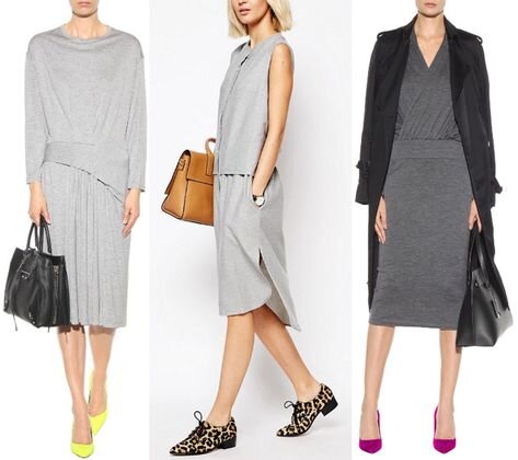 В свою очередь, серое платье в повседневном варианте будет отлично сочетаться с белыми кроссовками, большой сумкой-шоппером и ярким шарфом, повязанным на шее.