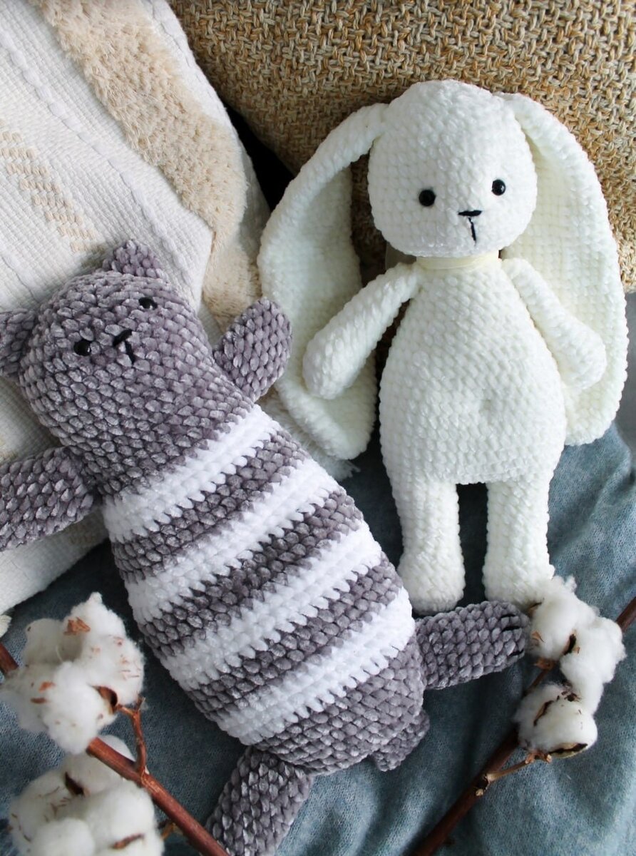 Недаром игрушки, связанные из велюровой, плюшевой пряжи, называют «зефирными». Ведь они получаются такими же мягкими, воздушными и притягательными, как любимая сладость. Их просто невозможно выпустить из рук. Хочется гладить, тискать и спать с ними в обнимку. А представляете, какая это радость для ребенка? Теперь, благодаря новым наборам Miadolla, вы сможете связать такую нежную «зефирку» самостоятельно. Знакомьтесь с новинками серии амигуруми, впервые из велюровой пряжи, – «Пушистым котиком» и «Пушистым зайкой». И вот 3 причины их связать Причина первая: обнимательная Эти игрушки невероятно «обнимательные». У них большой размер 30 и 31 см, они объемные, но при этом легкие благодаря небольшому весу велюровой пряжи и наполнителя (синтепуха). Они не только украсят комнату и станут друзьями ребенка в играх, но и послужат мягкой подушечкой для сладких грез. И главное, объятья котику и зайке нипочем, ведь велюровая пряжа совершенно не мнется. Такие игрушки очень нравятся детям своей особенн