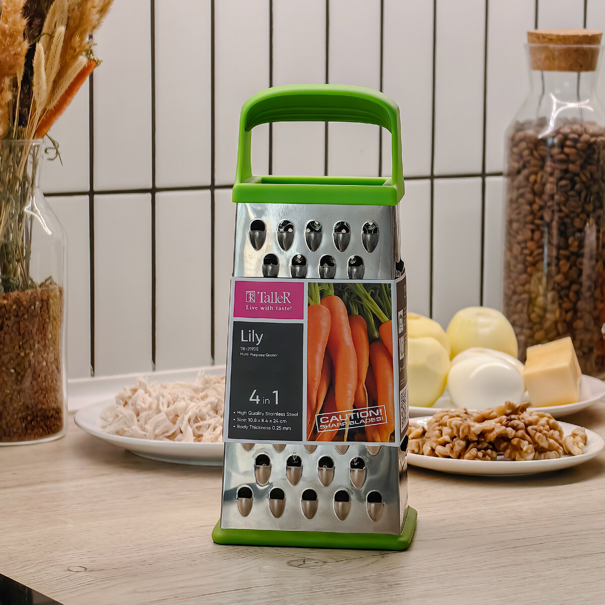 Обзор и технические характеристики тёрки TR-21925 4 лезвия Лили 🔸Высококачественная нержавеющая сталь марки AISI 430. 🔸Размеры: - высота - 25 см, - основание - 10,8 х 8,4 см, - толщина - 0,25 мм. 🔸4 вида лезвий: - крупная терка - мелкая терка (на широкой стороне), - средняя терка - шинковка (на узкой стороне). 🔸Большая площадь режущей поверхности. 🔸Специальная усиленная конструкция каркаса. 🔸Нескользящий силиконовый протектор на основании предотвращает скольжение во время использования и защищает поверхность от повреждений. 🔸Ручка с силиконовой вставкой, не выскальзывает из рук при использовании. 🔸Поверхность внешняя — зеркальная. ❕Пригодна для мойки в посудомоечной машине.