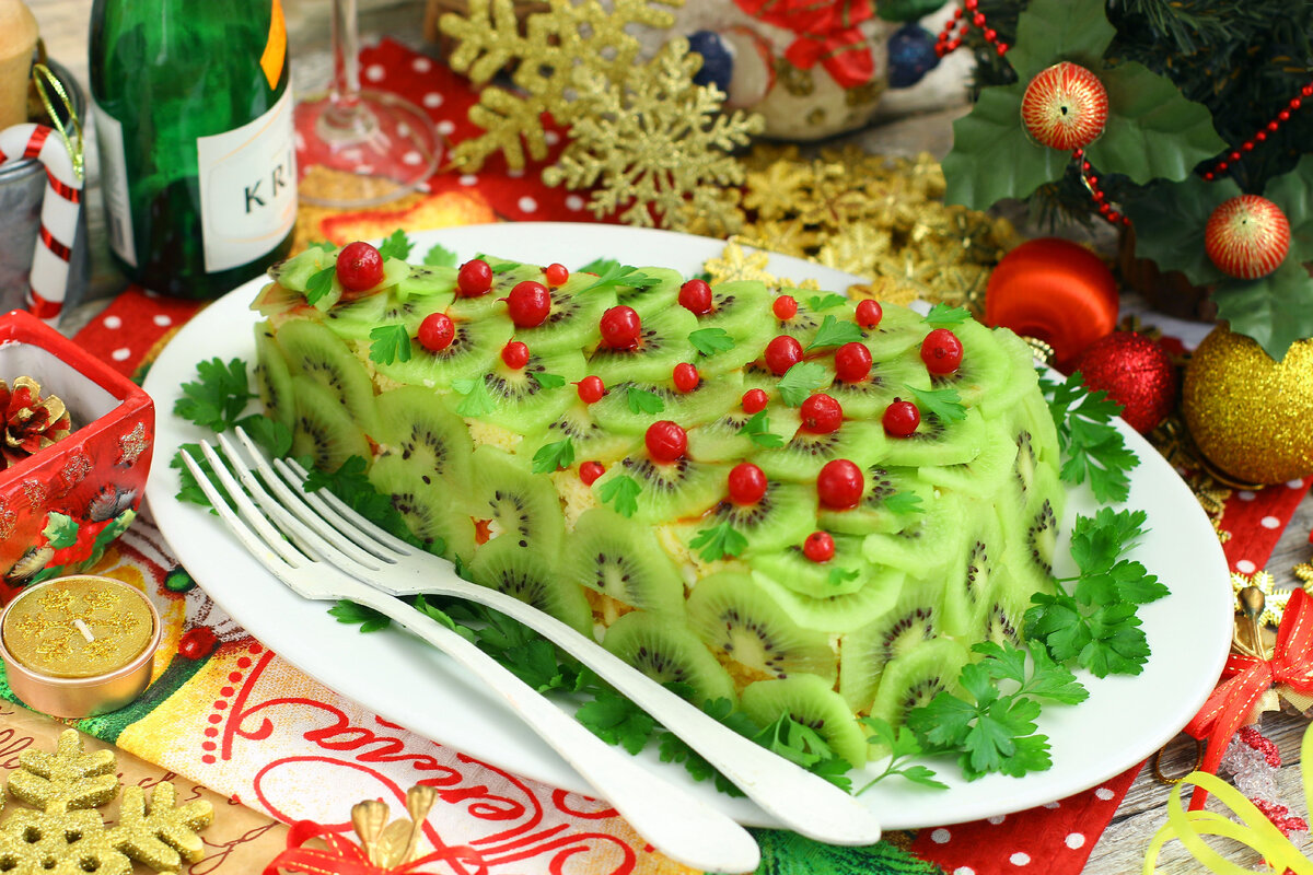 Нам понадобится: Филе куриное-300гр., морковь по-корейски-150гр., яйцо куриное-5шт., яблоко зелёное-2шт., сыр твёрдый-100гр., майонез-по вкусу., киви-5шт., клюква ягоды (гранат)-для украшения. Приготовление: Подготовьте всё необходимые продукты для приготовления салата. Куриное филе сварите до готовности в подсолённой воде. Время варки 20 минут с момента кипения воды. Мясо остудите, нарежьте небольшими кубиками. Подготовьте плоскую тарелку овальной формы для формирования салата. Нижним слоем выложите мясную нарезку в виде треугольника. В процессе раскладки всех компонентов вы сможете скорректировать необходимую вам форму. Курицу смажьте майонезом. Морковь по-корейски отожмите от маринада, длинные экземпляры разрежьте на несколько частей. Морковь выложите сверху на курицу, сделайте сетку из майонеза. Яйца заранее отварите "вкрутую", очистите, натрите на крупной тёрке, уложите сверху на морковь, также смажьте майонезом. С яблока счистите кожицу, удалите семена и прожилки. Выбирайте зелён