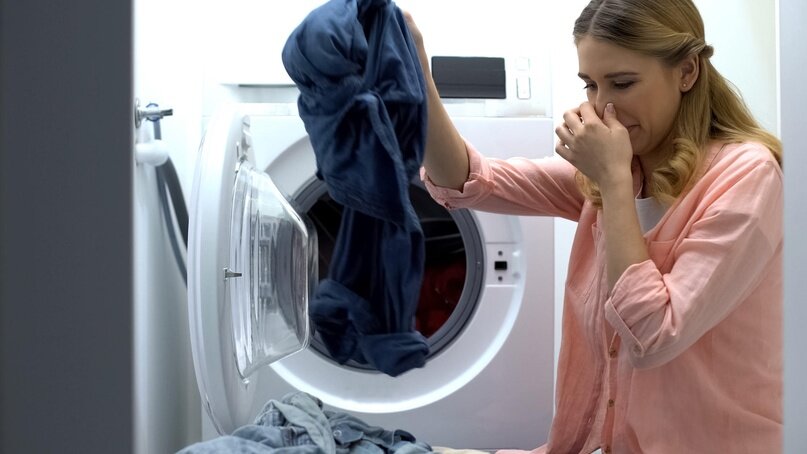 Это наиболее распространенный фактор образования ужасного запаха после стирки. Остатки жидкости и моющего средства не вымываются после полоскания и слива, постепенно скапливаются на дне бака, превращаясь в слизь с едким запахом. При следующей стирке вода растворяет образовавшуюся субстанцию и переносит частички на волокна тканей. В итоге предметы гардероба приобретают неприятный аромат.