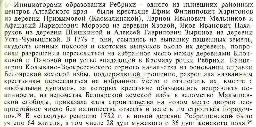 С уважением и полным доверием отношусь к Ю.С.Булыгину и его трудам, но очень хотелось лично прикоснуться к документу, подтверждающему основание села Ребрихи. Мне повезло ознакомиться с делом в краевом архиве, в котором зафиксировано и прошение крестьян и разрешение на переселение.