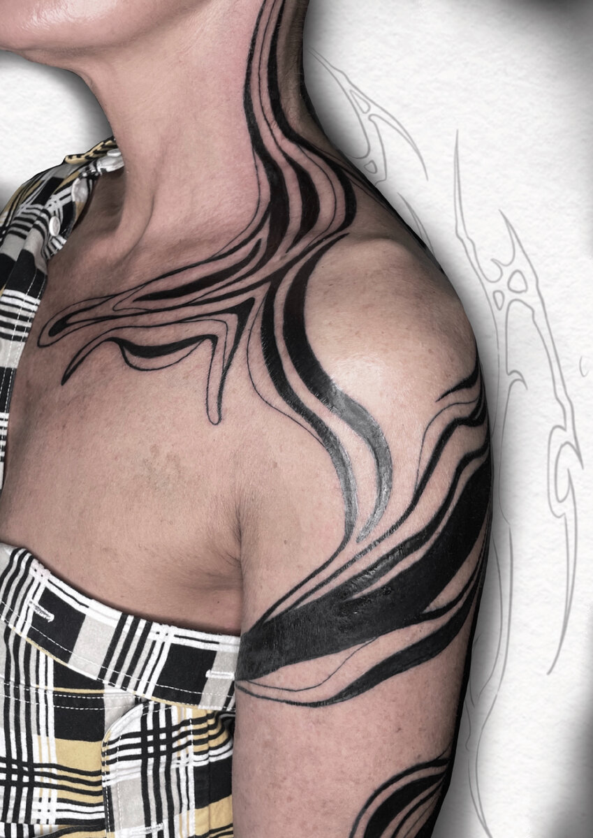 Абстракция набирает всё большую популярность, с чем это связано? 1. Это что-то новое, необычное. 2. Отсутствие смысла, то что просто украшает, как узор. 3. Анатомичность. Удачно расположенная абстракция, подчеркнёт изгибы вашего тела. 4. Даже в понятное изображение, можно добавить немного абстракции, и оно будет смотреться по новому. Однако как бы популярно это направление не было, мы так же хотим видеть на себе и понятные образы, которые ассоциируются у нас с важными или просто приятными, вещами. По этому не стоит бояться, что индустрия тату погрузится в безликие узоры. Именно по этой причине мастер работает как с абстракцией, так и с понятными сюжетами. Искусство может быть очень разным, и иногда сложно выбрать что-то одно.