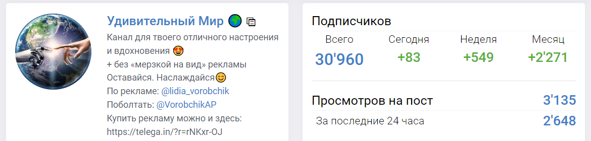 Меня зовут Виталий Воробьев. Я владелец канала Удивительный мир. Он давно приносит прибыль. Развиваюсь в Телеграм больше года. Делюсь информацией и обучаю тех, кому это интересно