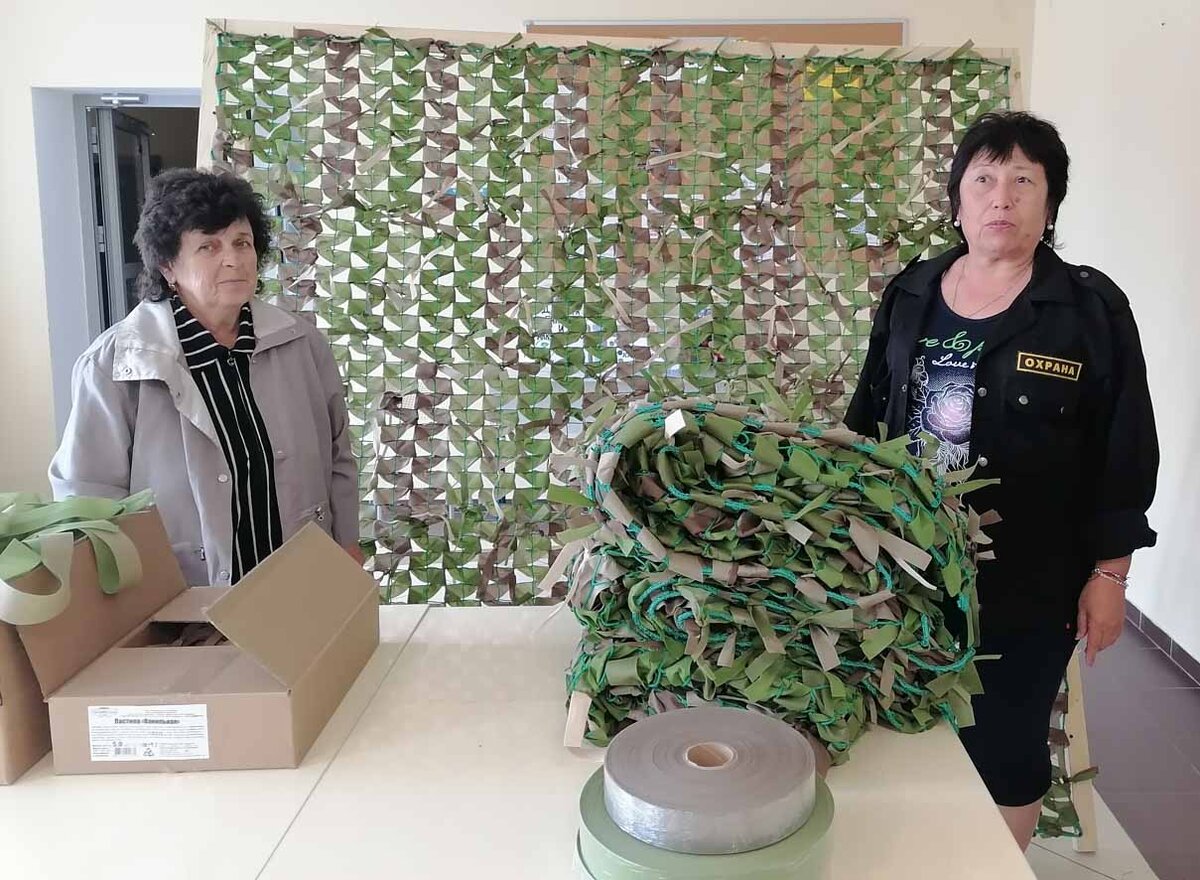 Одновременно задумались о том, как взяться за плетение маскировочных сетей самим. Где взять специальные пяльца? Где брать сетку из спанбонда и сам спанбонд разных оттенков, чтобы вязать сети? Однако, по словам Галины Кутявиной, мысль о том, чтобы по в помощи фронту таким способом, ее не оставляла. Она стала искать общественные организации, готовые предоставить материалы для плетения сетей. И они нашлись. По инициативе районных властей на лесопилке заказали пяльца. Когда их собрали, приехал человек из Боровска, показавший основные приемы плетения маскировочной сети. Затем стали привозить основы и уже нарезанные ленты ткани, а потом — просто рулоны спанбонда, который уже тут, в школе, разрезают, чтобы плести маскировочную сеть.
