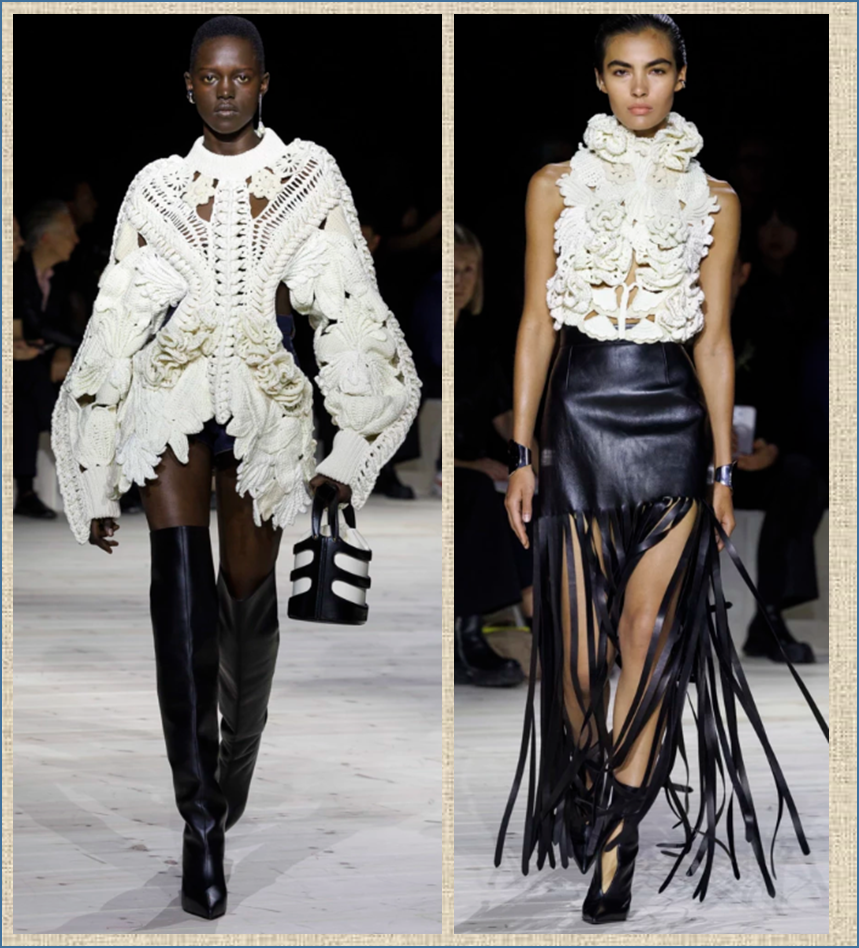 Мы с вами еще только-только ждем зиму и живем в ожидании Новогодних праздников, а вот известные дома мод давным-давно спроектировали, отшили и выставили свои коллекции на весну-лето 2024 года. Когда я рассматриваю модели, всегда в первую очередь выбираю вязание, трикотаж и вязание - мне это интересно. Но и другие разные, цепляющие взгляд штучки, я тоже собираю. Делюсь с вами некоторыми наблюдениями и находками на примере семи известных брендов. 1. Alexander McQueen, из коллекции весна-лето 2024 Вязание, ну что сказать? Неоднозначные впечатления, хотя безрукавая кофточка справа выглядит очень нарядной и вполне носибельной. Еще в этом показе мне понравилась линейка платьев с розами. Легкие, летящие. Но, наверное, для повседневности слишком прозрачные и просят подкладки. Привет, меня зовут Марина и я автор этого блога. Пишу о путешествиях, о том что вижу вокруг и еще рисую, обрабатываю и перерабатываю схемы жаккардовых узоров - такое хобби. А раз хобби, то схемы выкладываю бесплатно - в