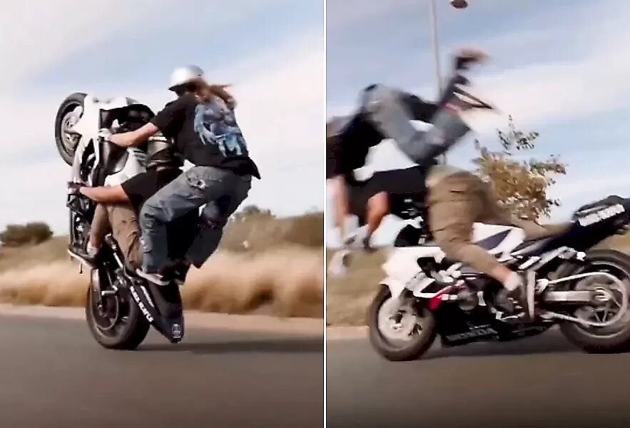 Оставшийся неизвестным любитель острых ощущений, передвигаясь на мотоцикле с подругой за спиной, угодил в крайне неприятную ситуацию, когда во время маневрирования девушка совершила незапланированный ею полёт. Мотоэкстремал, демонстрируя свои навыки в управлении байком, угодил в рытвину и неожиданно перекинул через себя юную пассажирку, которая, совершив жёсткую посадку, отделалась лишь ушибами и, со слов автора видео, отказалась от услуг медицинского персонала.