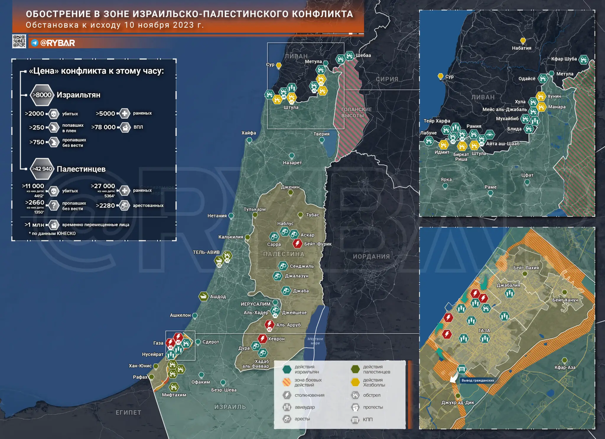Несмотря на занятость в секторе Газа, израильтяне продолжают наносить удары по сирийским территориям. И акцент делается не только на поражении иранских сил у своих границ, но и уничтожении боевого потенциала ВС САР в сфере ПВО, что подтверждается уничтожением средств РЭБ и ПВО ВС Сирии. А американцы в ночь с 8 на 9 направили по паре F-15 и F-16 с авиабазы Ас-Салти в Иордании к погранпереходу Аль-Бу-Кемаль, где были нанесены удары по складам иранских прокси на востоке Дэйр-эз-Зора и в окрестностях Аль-Маядина.