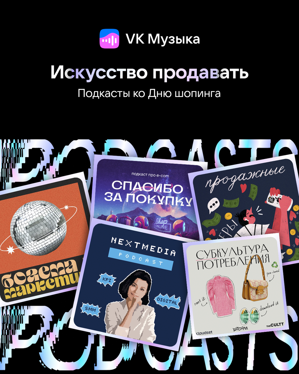 Сегодняшняя подборка подкастов — в честь Всемирного дня шопинга. Разбираемся в бесконечно интересном мире современного потребления вместе с маркетологами, блогерами и представителями самых разных индустрий. Полную подборку подкастов об искусстве продавать смотрите по ссылке. А мы от себя посоветуем 5 лучших, по мнению редакции. 🎧 Богема и маркетинг Неутомимая Саша Рудко, знакомая многим по подкасту «Скоро 30», окунулась в формат с головой: она руководит собственной студией и ведёт отдельный цикл о современном маркетинге. Гости эфира очень своевременно рассказывают о новых инструментах продвижения и учат разбираться в трендах индустрии. Особое внимание в подкасте уделяют развитию личного бренда, поэтому смело рекомендуем «Богему и маркетинг» молодым музыкантам, блогерам и другим независимым творческим кадрам. 🎧 Спасибо за покупку Адаптация «олдов» мира торговли к реалиям эры онлайн-коммерции — основная тема этого недавно стартовавшего подкаста. В каждом эпизоде опытный маркетолог Юрий