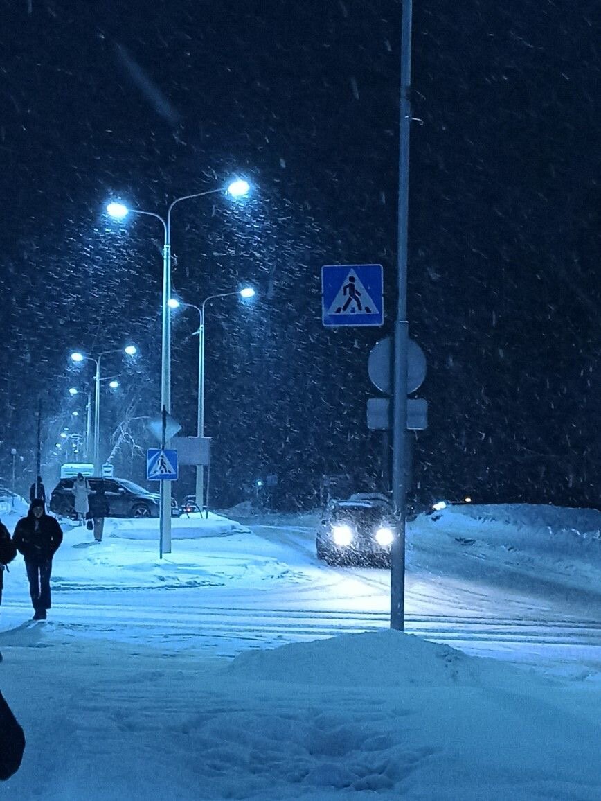 Иду по тротуару к автобусной остановке. Снега нет. Улица выглядит мёртвой. Слабые мерцающие огоньки особо не освещают дорогу. Лёгкие облака похожи на призраков.