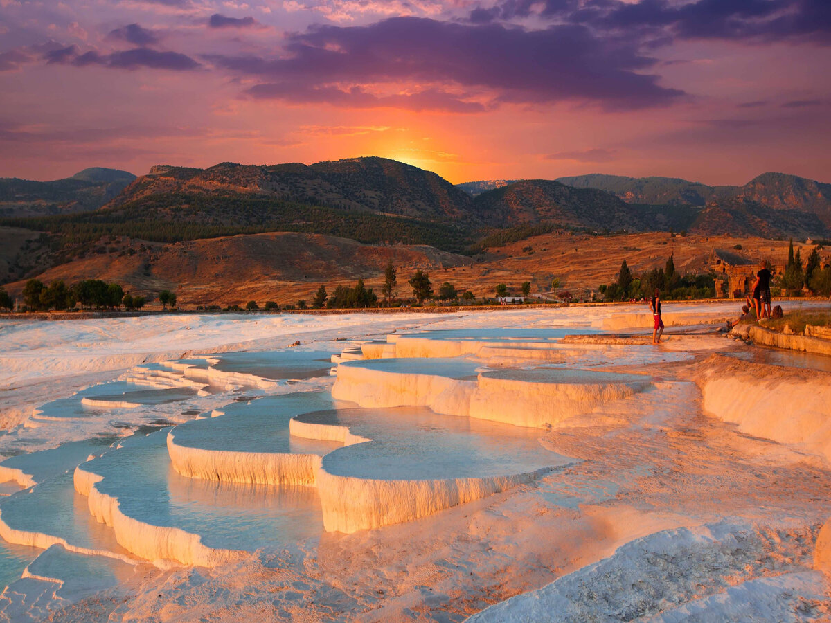 Травертиновые террасы Памуккале стали самой посещаемой достопримечательностью Турции: в 2014 году там побывало более 1,5 млн туристов, большинство из которых – россияне. Мы собрали самые интересные факты об этом удивительном чуде природы. 1. Название Памуккале в переводе с турецкого языка означает «хлопковый замок». Действительно, система причудливых белых террас (травертиновых образований) больше всего напоминает огромную гору хлопка. Легенда утверждает, что белоснежные горы появились во времена, когда здесь жили титаны, которые собрали урожай хлопка и положили его сушиться на солнце. Оставленный без внимания хлопок затвердел и превратился в камень. На самом деле природный феномен своему появлению обязан бьющим в этой местности геотермальным источникам. Ослепительно-белые природные бассейны на склоне горы Чал даг образовывались в течение миллионов лет благодаря осадкам карбоната кальция, содержащегося в воде. Всего таких источников 17. Осадок сначала скапливается в виде студенистой ма