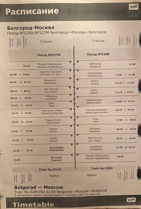 Тем не менее, после 12-летнего перерыва, с декабря 2024 года, руководство АО Федеральная пассажирская компания (дочернее общество АО РЖД - компания-перевозчик пассажиров и багажа в поездах дальнего следования) всё же приняло решение о запуске нового пассажирского поезда 🚆№ 527/528 Москва – Белгород, через участок Елец – Лев Толстой – Раненбург Юго-Восточной железной дороги следующим графиком: