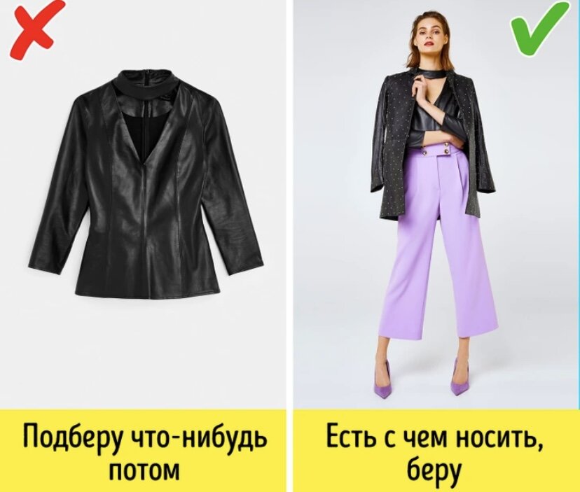 Если вы хотите раз и навсегда забыть о проблемах с вашим гардеробом, главное, что нужно сделать, — перестать выбирать отдельные вещи, а начать мыслить цельными, законченными образами, включая аксессуары. Прежде чем купить какую-то вещь, спросите себя, с чем вы будете ее носить. Если на ум пришло 3–4 варианта, с чем можно ее скомпоновать, только тогда вещь можно покупать.