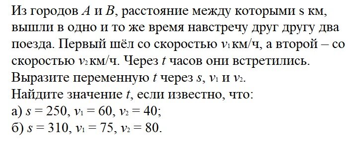 Решение задачи на скорость, время и расстояние Условие: Решение: В задачах 932 и 933 учебника за 7-й класс мы уже вспоминали, что для того чтобы найти расстояние, нужно умножить скорость на время: В данной же задаче для того, чтобы найти расстояние между городами, надо время умножить на сумму скоростей первого и второго поезда, так как за время t они прошли расстояние s вместе: Отсюда следует, что для того, чтобы найти время, надо расстояние разделить на сумму двух скоростей: