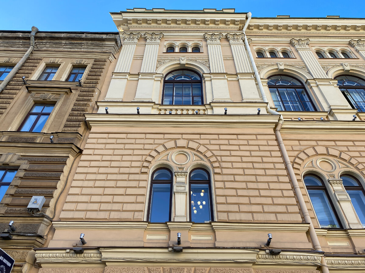 А теперь перейдем к самому интересному. Здание это было построено в 1879 году для Петербургского городского кредитного общества. Само же Общество появилось в 1861 году и стало тогда первым частным коммерческим банком во всей Российской империи. До его появления все кредитные учреждения были государственными. Однако, Общество было не совсем банком, в привычном нам понимании, а скорее ссудным учреждением, выдававшим средства для строительства, под залог недвижимого имущества - т.е. по сути занималось ипотечным кредитованием. Получается, что сейчас практически восстановлена историческая справедливость и в здании по-прежнему располагается кредитное учреждение. Но так было не всегда. После революции 1917 года здание стало "общенародной собственностью" и использовалось сначала управлением коммунального хозяйства, а после его занимало управление метростроя. Но, что-то я увлеклась историческими подробностями, давайте вернемся все же к самому зданию.