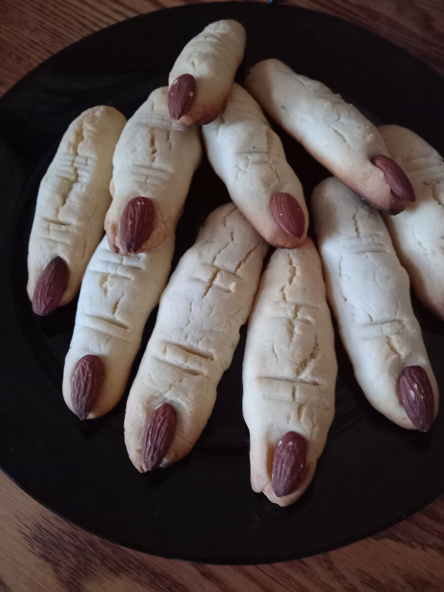 100 грамм размягченного сливочного масла, 1 яйцо, 2 ст.ложки сахара, 250 грамм муки и разрыхлитель. Все хорошо смешать. Сделать тесто. Из теста сделать пальцы, прекрепить орех вместо ногтя. Запекать 15 минут.