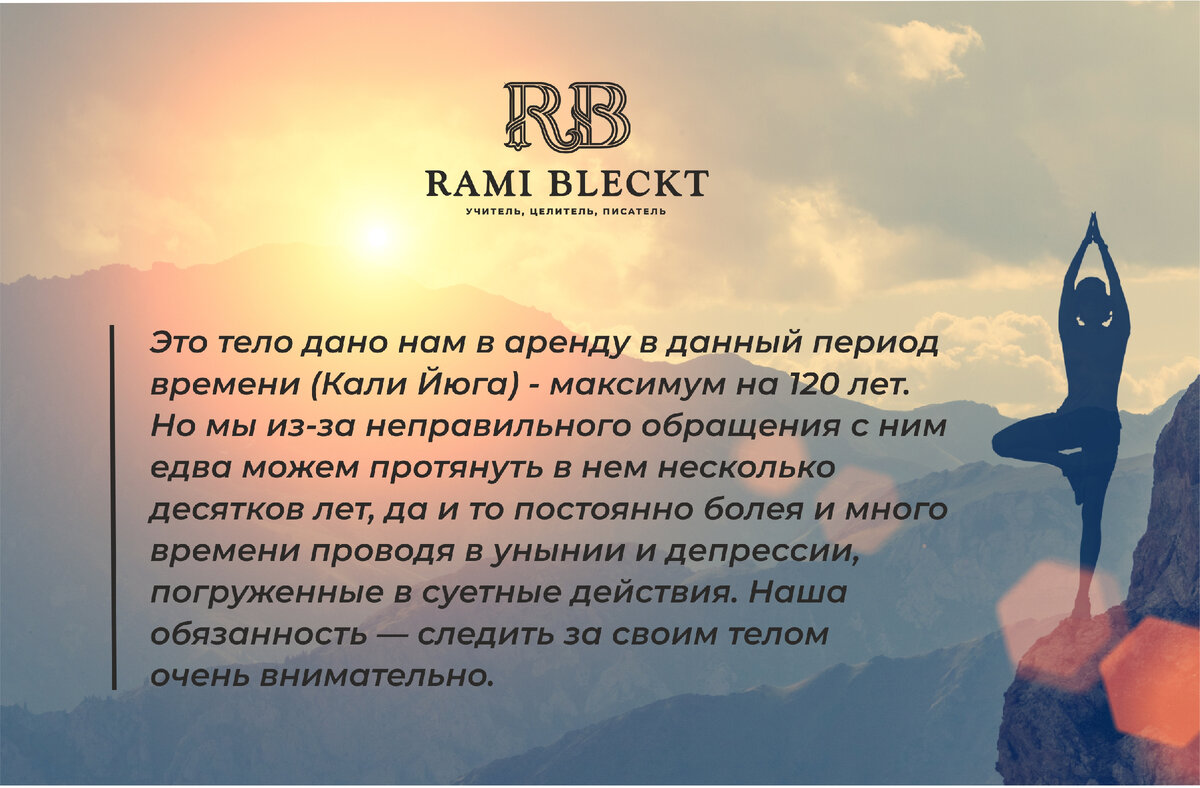 Первостепенное богатство – это здоровье. Это величайшее из всех владений. Это основа добродетелей. Без здоровья жизнь не жизнь. (Свами Шиванада) Через препятствия и страдания можно прогрессировать быстрее, но только если они даются свыше. Если мы с вами разрушаем свое тело и интеллект, увеличиваем беспокойство ума своими неправильными мыслями, действиями, стилем жизни, то за это мы будем еще больше страдать и быстрее деградировать. Великий русский врач Устюгов считал, на основе множества исследований, что сейчас люди почти не умирают от старости, скорее о неправильного образа жизни. В первую очередь нужно следить, чтобы был гомеостаз. Он зависит от правильного ментального настроя, образа жизни. Регулярно проводить чистку тела, в первую очередь кишечника и печени. И современная медицина, и Аюрведа утверждает, что от чистоты кишечника наше здоровье зависит примерно на 95% и, что печень важнейший орган в нашем теле. Важно проводить чистку почек, суставов, ну и всего тела в общем. Конечно