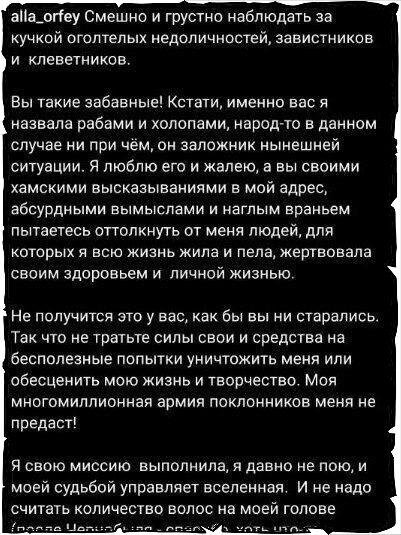 Алла Борисовна в запрещенной сети вдруг о себе заявила и сразу, друзья, лихо начала. Мне, заявила звезда советской эстрады, смешно и грустно наблюдать за кучкой недоличностей, завистников. Это где она к себе зависть увидела? Алла пожилая приезжала недавно в Россию. Все прямо написали, по перрону певица еле шаркала. Платком стыдливо личико скрывала. Мышкой шмыгнула по делам. И тут же, тут же уехала обратно. Где зависть то? К чему? В ее возрасте она скорее всего не выдаст уже шедевров. Мало кто может в преклонных годах творить как в юности. Короче, пост сумбурный, чувствуется ворчание пожилого человека. Смотрите. Забавно вот еще что. Она всеми силами пытается убедить население - 140 миллионов человек - что не их обозвала. А неназванную кучку людей. А чего их не представила? Мы как догадаемся кто они? Имена, сестра, имена))) Это Алла так элиту России нарекла? А зачем тогда ручку Пескову на похоронах Юдашкина для поцелуя протягивала? Он, конечно, холоп, но что поделать, если нрави