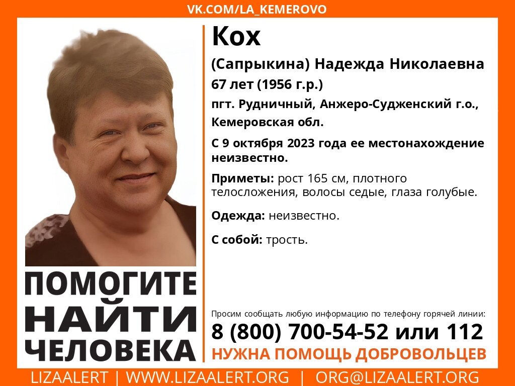 О местонахождении жительницы пгт Рудничный Надежды Кох (Сапрыкиной) ничего неизвестно с 9 октября этого года. В приметах указано, что рост женщины составляет 165 см, она полного телосложения, с седыми волосами и голубыми глазами.