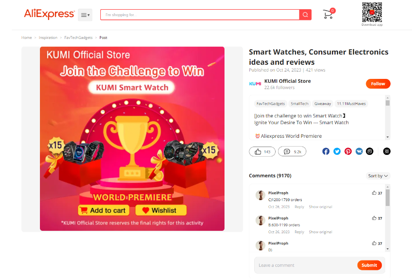 Нечасто выпадает возможность бесплатно получить современный гаджет, но сейчас как раз такой случай. Что самое приятное — не нужно ни за что платить. Бренд KUMI проводит в своём интернет-магазине на AliExpress бесплатную раздачу смарт-часов случайным пользователям. Чтобы получить шанс на выигрыш, не придётся покупать что-либо, достаточно выполнить несколько очень простых действий. Перейдите по этой или этой ссылке и добавьте KUMI Official Store в избранное, добавьте любой продукт из этого магазина в корзину и в избранное, а затем напишите в чате на странице магазина что угодно. Должно получить что-то вроде этого: