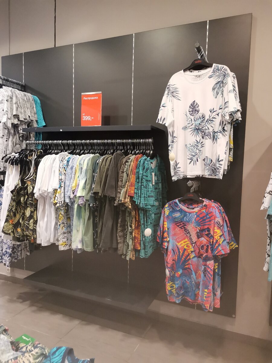 В подборке представлены довольно яркие футболки, принты у них прямо-таки летние, но и среди них есть более базовые варианты. Можно заметить что на вешалках как раз одежда без крупных рисунков или броских красок. Многие и вправду стоили всего 399 рублей, некоторые чуть дороже, но в основном цена 499-599 рублей. Ткань мягкая, футболки довольно тонкие, но ткань не прозрачная.