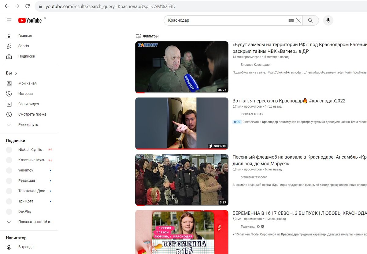 Хостинг Youtube 11 ноября опубликовал самые популярные видеоролики, связанные с Краснодаром. При запросе «Краснодар» в Youtube и выборе фильтра «По числу просмотров» выдаётся много интересных видео. Пятёрку самых просматриваемых видео замыкает ролик Николая Сомсикова, который показывает выставленный на продажу дом за 3,6 млн рублей. Казалось бы, обычное видео. Но за три месяца оно набрало 3,7 млн просмотров. На четвёртом месте – выпуск программы «Беременна в 16», опубликованный на ютуб-канале «Телеканал Ю». Героиней выпуска стала 15-летняя Люба Сорокина из Краснодара. За месяц видео набрало 5,3 млн просмотров. Скрин "Youtube.com" «Бронзу» получило видео песенного флешмоба у вокзала «Краснодар -1». Ансамбль «Криница» шесть лет назад исполнил украинскую песню «А я все дивлюся, де моя Маруся», набрав на Youtube свыше 6,3 млн просмотров. На втором месте в рейтинге популярности хостинга видео канала «IGORIAN TODAY». Блогер записал видео «понаехи» о своём переезде в Краснодар, собрав 6,7 млн