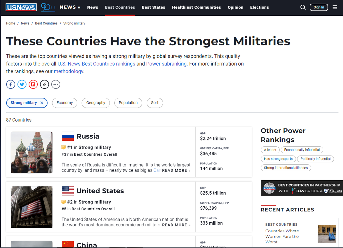 Данные опубликовал в понедельник, 30 октября, американский журнал U.S. News & World Report. Россия получила 94,3 балла из 100 в категории «Власть». При этом в подкатегориях «Сильная армия», «Лидер» и «Политическое влияние» она была оценена на максимально высокий балл.