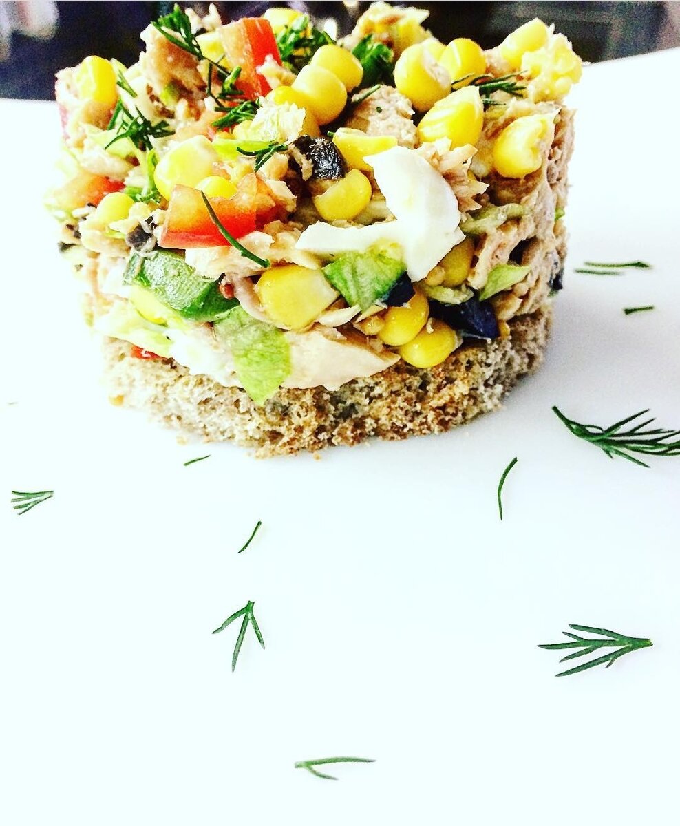 Очень красивая подача. Полезно и вкусно. Ингредиенты на две порции: 1 банка лосося в собственном соку (можно любую красную рыбу); столовая ложка оливок ; столовая ложка кукурузы; 1-2 вареных яйца ; 1/2 красного болгарского перца; 1,2 Листья салата айсберг; 1/2 авокадо; бездрожжевой хлеб; укроп . Заправка - столовая ложка оливкового масла; чайная ложка французской горчицы. Приготовление: все нарежьте и смешайте с заправкой. Придайте тостам форму и подсушите их на сковороде без масла. Выложите его в форму и быстрее ешьте вкусняшку 😋