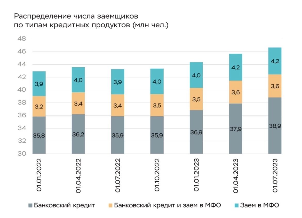 В первом полугодии 2023 года число заемщиков в России увеличилось еще на 2 млн, их общее количество приблизилось к 47 млн человек 📌 17% из них имеют хотя бы один заем в МФО 📌 увеличилось количество заемщиков, имеющих три кредита и более — до 11,2 млн человек (+1,4 млн за полгода) 📌 количество ипотечных заемщиков превысило 10 млн человек. Почти половина (46%) имеют дополнительно к ипотеке хотя бы один необеспеченный кредит 📌 каждый второй ипотечный кредит в первом полугодии 2023 года был выдан на срок более 25 лет 📌 растет долг граждан по необеспеченным потребительским кредитам. Среднее количество кредитов у заемщиков, получивших необеспеченный кредит в первом полугодии 2023 года, составило 2,8 единицы (в конце 2022 года - 2,6 единицы) 📌 существенно выросло количество заемщиков в сегменте «Кредитные карты» - до 23 млн человек (+3 млн за год)