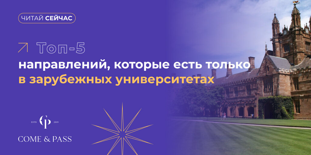 Если вы мечтаете о том, чтобы получить образование за границей, то первое, о чем стоит задуматься — это выбор направления. Сильная и перспективная специальность, четко сформулированная цель — то, что помогает не только зацепить приемную комиссию (например, в мотивационном письме), но и получить стипендию. Если вы не можете определиться с направлением и не знаете, что вам интересно, то приходите на бесплатную консультацию в Come&Pass — наши наставники помогут «распаковать» ваши увлечения, подсветят сильные и слабые стороны, предложат программы, которые востребованы в той или иной стране.