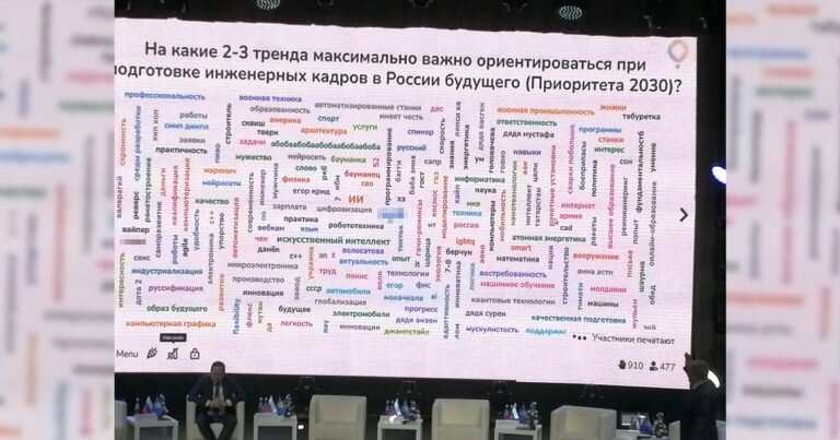 Вчера в МГТУ им. Баумана начался конгресс «Русский инженер». Главным событием дня стало пленарное заседание, которое посвятили теме воспитания «инженеров будущего». Организаторы решили внести немного интерактива в официальное мероприятие и попросили участников форума, среди которых было полно студентов, в онлайн-формате ответить на вопрос: «На какие два-три тренда важно ориентироваться при подготовке инженерных кадров в России будущего?» Но результаты, которые тут же сгенерировали на экран, превзошли все ожидания. «Спинер», «шаурма», «тверк», «симпл-димпл»,«ХЗ», «СССР», «боеприпасы», «Махачкала», а также «х..й» и «п..а» — таков неполный список трендов, на которые, по мнению бауманцев, придется ориентироваться инженерам. В общем, все будет точно так же, как и сейчас, и никакой Илон Маск этого не изменит. Конечно, в перечне нашлось место и «робототехнике» с «инновациями», но большинство все же оказалось не столь прилежно в выборе ответов. В соцсетях комментаторы разделились: кто-то начал