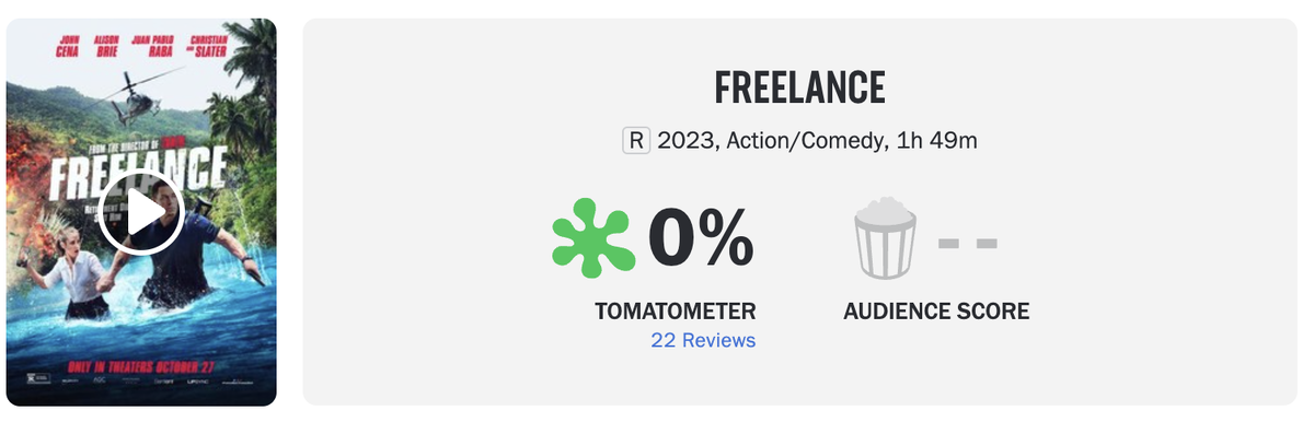 Джон Сина хорошо известен своими боевиками, однако его новый фильм "Фриланс" похоже стоило бы оставить на полке. По данным агрегатора рецензий Rotten Tomatoes, фильм получил 0% одобрения, основываясь на 22 обзорах критиков на момент написания. В картине Сина исполнил роль Мейсона Петтитса, пенсионера из спецназа. Покинув военную службу и став юристом в пригороде, он решает стать охранником журналистки (Элисон Бри) во время ее интервью с президентом вымышленной южноамериканской страны. Режиссером выступил Пьер Морель, известный работой над "Заложницей" с Лиамом Нисоном и "Из Парижа с любовью" с Джоном Траволтой. Это должен был быть зрелищный и веселый фильм, но "Фриланс" не оправдал ожиданий. Хуже того, кажется, что он даже не пытался.— Анджи Хан из The Hollywood Reporter Во "Фрилансе" абсолютная пустота. Нет романтики, комедии или экшена. Есть полузавершенные попытки сделать что-то из этого, но ничего не срабатывает.— Брайан Таллерико на RogerEbert.com Джон Сена заслуживает лучшего. Ка