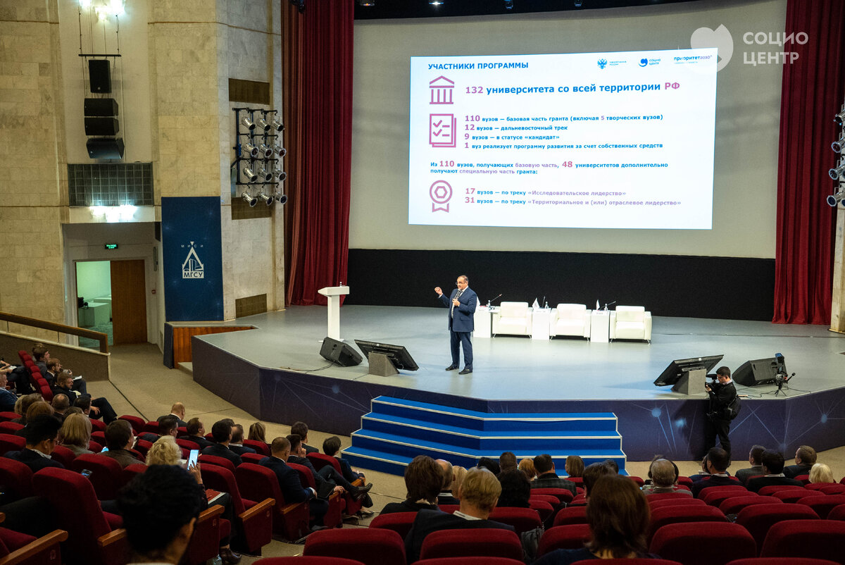 27 октября в Московском государственном строительном университете (НИУ МГСУ) в рамках форума «Трансформация университетов через реализацию программы развития: дорога в “Приоритет”» прошла сессия «Программы развития и преимущества программы “Приоритет 2030”». Её цель — поделиться накопленным опытом и инструментарием с вузами, готовящимися стать участниками программы. Модератором мероприятия выступил руководитель Социоцентра Андрей Келлер. Представители вузов различных регионов рассказали о своём уникальном опыте реализации программ развития. Спикеры выступили с докладами, а затем в формате диалога обсудили наиболее значимые вопросы. Первым выступил ректор Приволжского исследовательского медицинского университета Николай Карякин. Он рассказал, какие импульсы дала вузу программа развития: «Мы начинали с численности студентов 5600 человек, сейчас уже подходим к 8000, года через полтора мы подойдём к 9000. За время реализации программы наша команда чётко осознала, что университет — это не