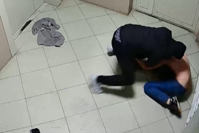 Немного погодя камеры зафиксировали, как этот же парень дерется на полу с одним из приятелей. В итоге дебошир, которого в эту ночь просто распирала агрессия неясного происхождения, вышиб ногой стекло в подъездной входной группе.