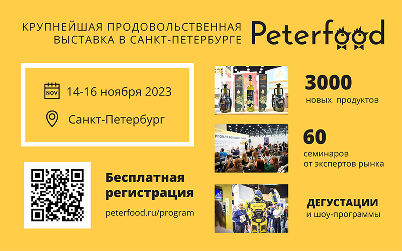 Уже совсем скоро, с 14 по 16 ноября, в Санкт-Петербурге пройдет крупнейшая продовольственная выставка в СЗФО — «Петерфуд». Ожидается, что всего за три дня мероприятие посетят более 7000 представителей рынка FMCG. По традиции, в рамках выставки производители продуктов питания и напитков презентуют новые продукты, оборудование и услуги. В этом году, помимо российских производителей, на выставке можно будет ознакомиться и провести переговоры с компаниями из Индии, Вьетнама, Камеруна, Ирана, Алжира и других стран. Среди экспонентов будут известные лидеры рынка: Помимо этого, на «Петерфуд» пройдут масштабные переговоры и презентации: Помимо выставки и переговоров с закупщиками на «Петерфуде» пройдет Открытая деловая программа «Торговля Большого Города», конкурсы для производителей «Наша Марка», «Инновационный продукт» и «Выбор сетей». «Петерфуд» – крупнейшая выставка Северо-Запада в сфере продовольственной торговли. Регистрация на мероприятие доступна ПО ССЫЛКЕ.