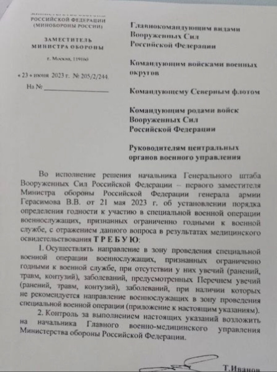С какими заболеваниями нельзя направлять в зону СВО в соответствии с указаниями заместителя Министра обороны РФ от 23.06.2023 № 205/2/244: