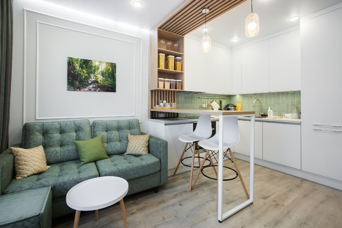 Больше пространства — больше места для смеха, душевных разговоров, семейных посиделок и романтических вечеров. Объединённые пространства не являются новинкой и знакомы многим из вас. И именно этот факт позволяет сделать вывод, что это — не погоня за хайпом, а настоящий тренд, который останется с нами навсегда. Благодаря такому виду зонирования гости и хозяйка дома всегда находятся вместе. Пространство можно разделить как душе угодно — барной стойкой, столом или диваном. Главное — визуально помещение кажется больше и просторнее.
