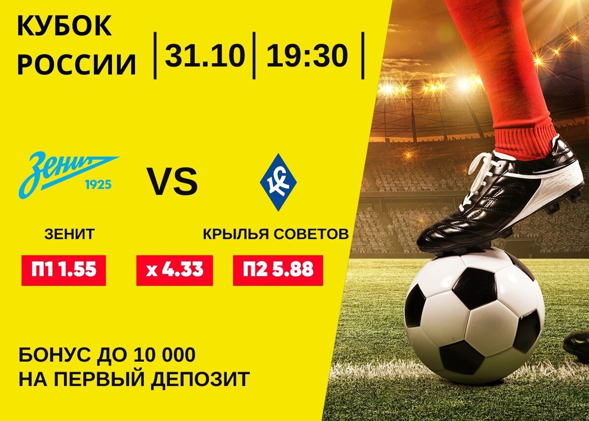 Одним из центральных матчей Кубке России 31 октября станет матч между «Зенит» и «Крылья Советов». В BetBoom коэффициенты на победу "Зенит" - 1.55, "Крылья Советов" - 5.88. Коэффициент на ничью 4.33. Если ты ранее не делал ставки в этой БК, то можешь воспользоваться бонусом до 10000 на первый депозит по промокоду